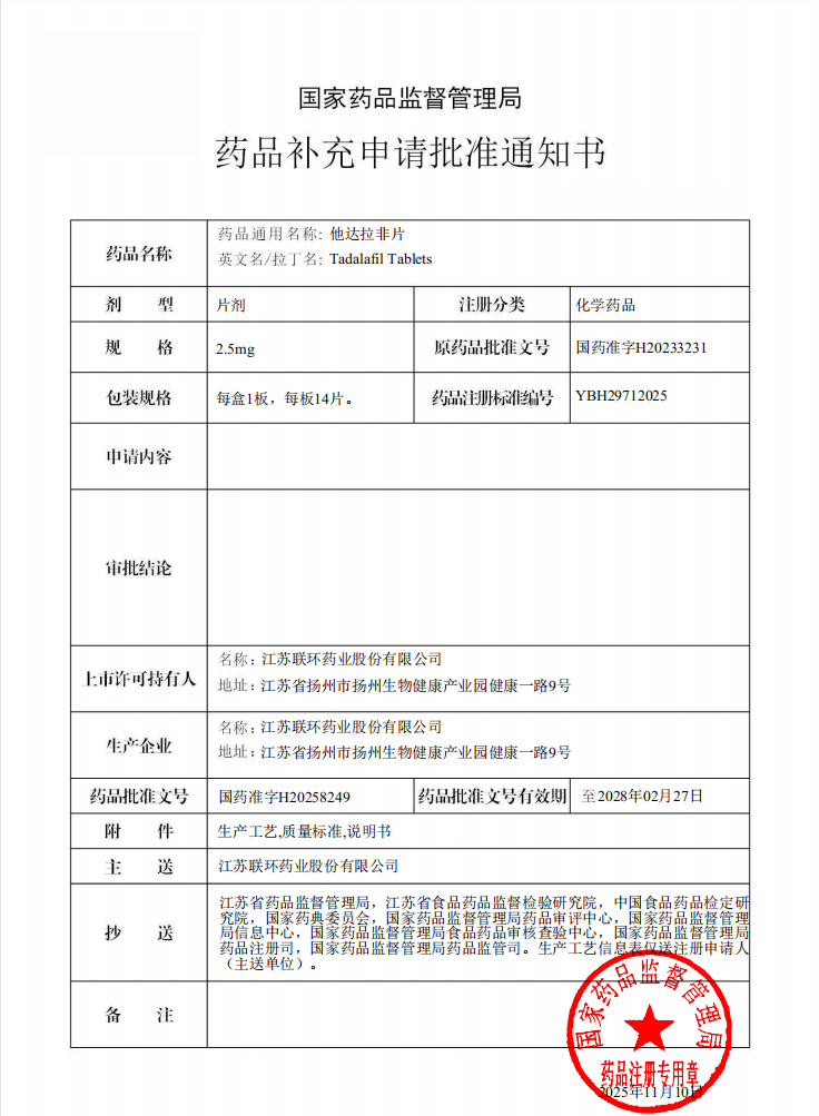 近期,从国家药品监督管理局传来喜讯,九州酷游(ku游)他达拉非片(2.5mg、5mg)取得药品补充申请批件。随着2.5mg和5mg规格的获批,公司在不到3年时间内成功完成他达拉非片所有主流规格(2.5mg、5mg、10mg、20mg)的上市布局。